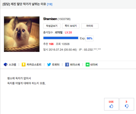 | 일반 | 독자를 절대 무시하지 않는 작가[0] | 린스갓 | 2016-07-24 14:17 | 1349 | 0 |