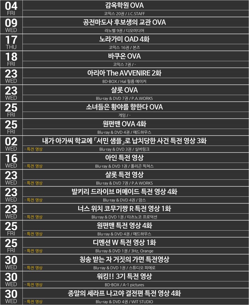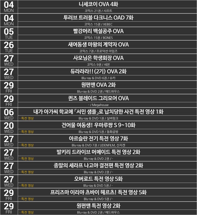 > [1차 정렬 : 발매일 순 / 2차 정렬 : 가나다 순 / 3차 정렬 : OVA,OAD,MOVIE > 특전 영상 순]입니다.