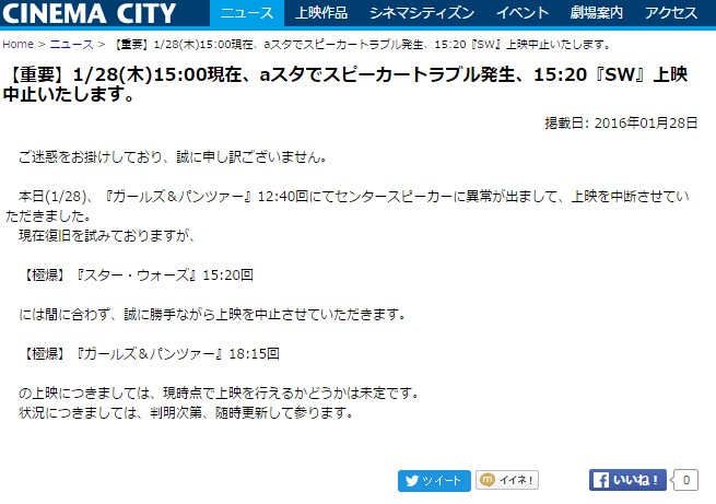 타치카와 시네마시티, 걸판 극장판 상영중 스피커 고장 발생