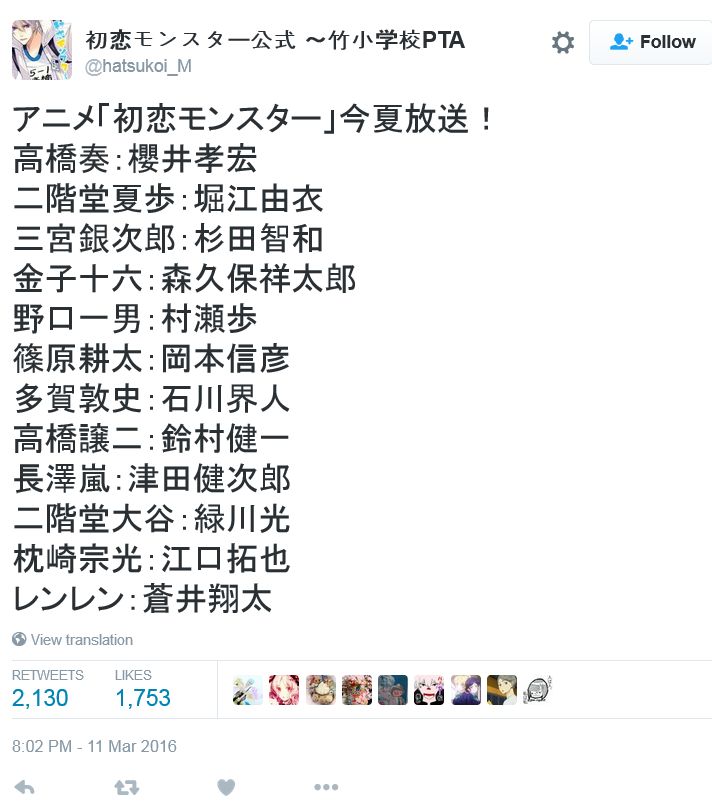 '첫사랑 몬스터'와 관련하여, 추가로 성우 에구치 타쿠야씨와 아오이