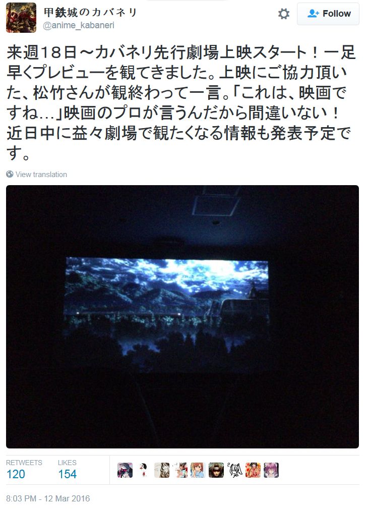 2016년 4월 신작 애니메이션 '갑철성의 카바네리'의 선행 극장 상영이 오는