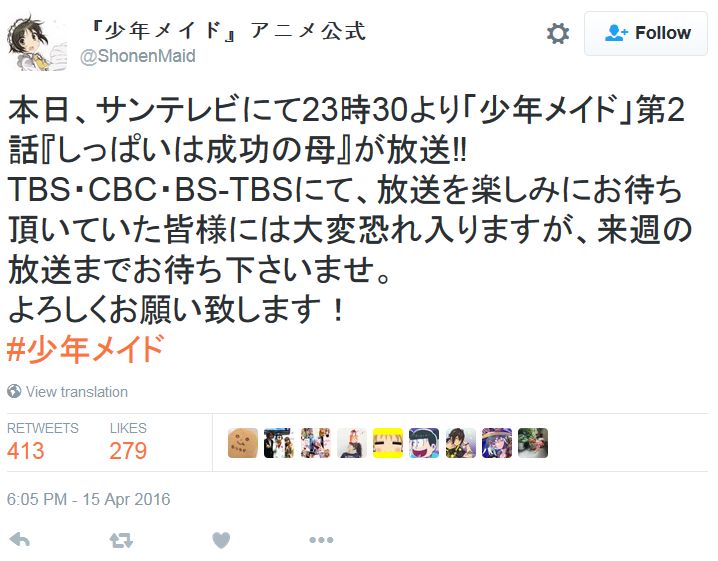 TV 애니메이션 '소년 메이드' 제 2화가, 지난 2016년 4월 14일 심야에는