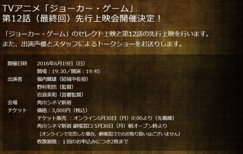 TV 애니메이션 '조커 게임'의 선택 상영 및 제 12화 선행 상영 이벤트가