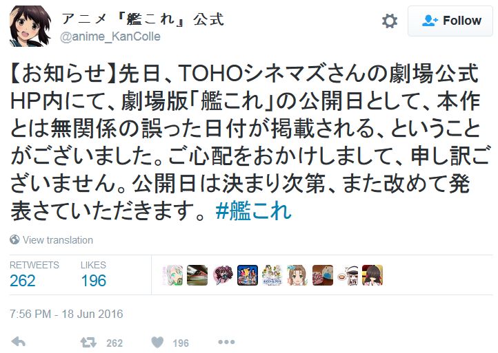 함대 컬렉션 트위터에서 극장판 개봉일 관련 정정 공지