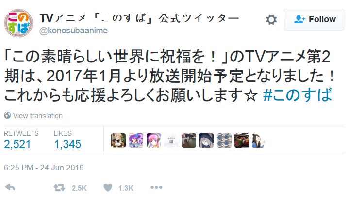 - 애니'이 멋진 세계에 축복을!' TV 애니메이션 2기는 2017년 1월 방송 예정[9]미유조회 3122추천 6