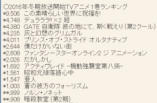 2016년 1월 신작 애니메이션 제 1권 판매량 업데이트