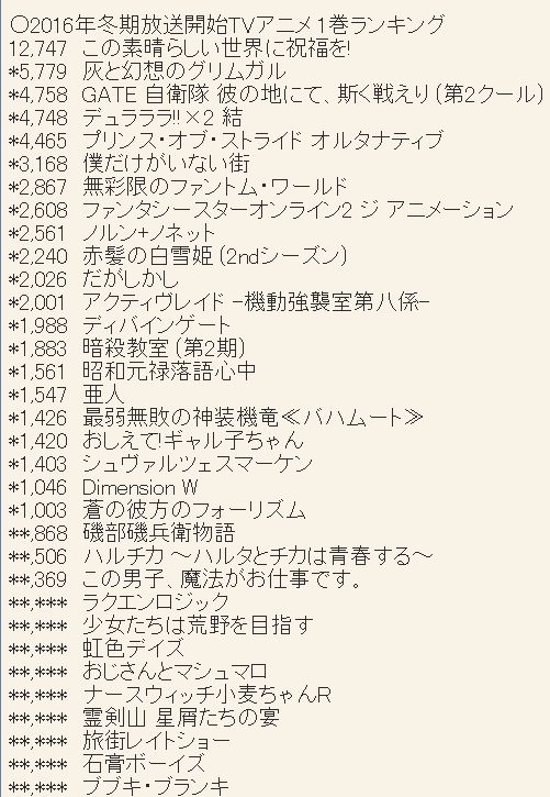 ※ 2016년 겨울(1월) 방송 개시 TV 애니메이션 블루레이 & DVD 제 1권 판매량 랭킹