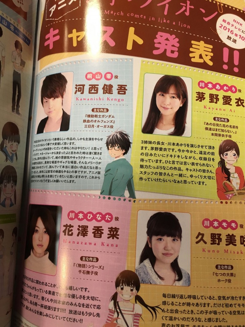 TV 애니메이션 '3월의 라이온' 주요 성우진 정보
