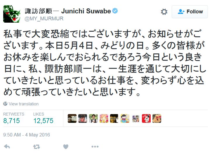 성우 스와베 쥰이치씨가 트위터에 진지하게 올린 개인적인 공지가 화제