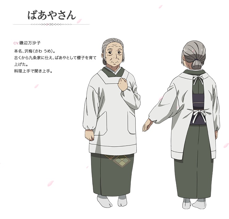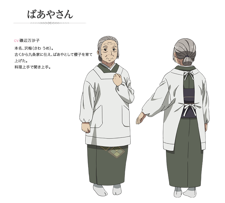 사쿠라코의 집에서 일하는 할머니. 옛날부터 쿠죠 가문에 종사하면서 유모로써 사쿠라코를 길렀다. 요리를 잘하고 이야기도 잘 들어준다. 하지만 엄한 모습을 보여줄 때도 있다. 나이때문에 요통을 가지고 있어 사쿠라코가 신경써주고 있지만 자신의 역할에 책임감을 가지는 모습을 보인다.