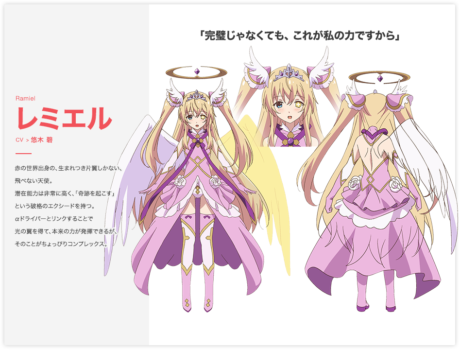 에르엘과 같은 적세계의 주민. 날개가 하나로 자신은 그런 자신의 모습을 싫어한다. 하지만 α 드라이버와 링크를 하면 빛의 날개가 생긴다.