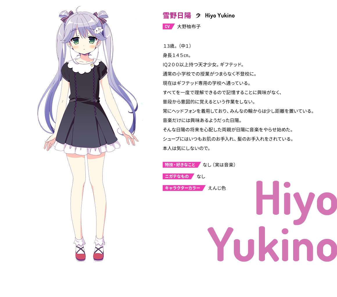 IQ 200이상의 천재 소녀. 일반적인 초등학교의 수업이 지루하여 등교를 하지 않고, 현재 영재 학교를 다니고 있다. 모든 것을 한 번이면 이해할 수 있기 때문에 평소에 일부러 기억하려고 하지 않는다. 언제나 헤드폰을 끼고 있으며, 모두에게서 살짝 거리를 두고 있다.