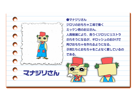 치키의 아버지. 돈질라의 공장에서 일하는 공장 직원. 장난감 공장에서 일하다가 경영주 돈질라가 장난감 만드는 기계를 사들이자 명예 퇴직당한 적이 있다. 하지만 그 다음날 밤, 괴도 기롯슈가 그 기계를 훔쳐가서 돈질라가 다시 직원을 고용해 일자리를 되찾았다.