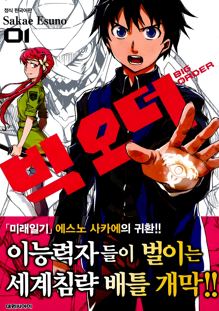Sakae Esuno의 만화 『빅 오더』 제1권. 호시미야 에이지가 원한 것은 '세계의 멸망'이었다-. 10년 전 세계는 의문의 대 파괴현상으로 인해 한 번 멸망할 뻔했다. 그것은 어린 에이지의 '소원'이 우연히 이루어진 데서 비롯된 일이었다! '오더'라 불리는, '소원'을 '능력'으로 변환시키는 능력자들이 판치는 세계. 전학생 쿠레나이 린과의 만남으로 에이지의 운명은 크게 요동치기 시작한다!! 세계 침략 배틀 스토리, 여기에 개막!!
